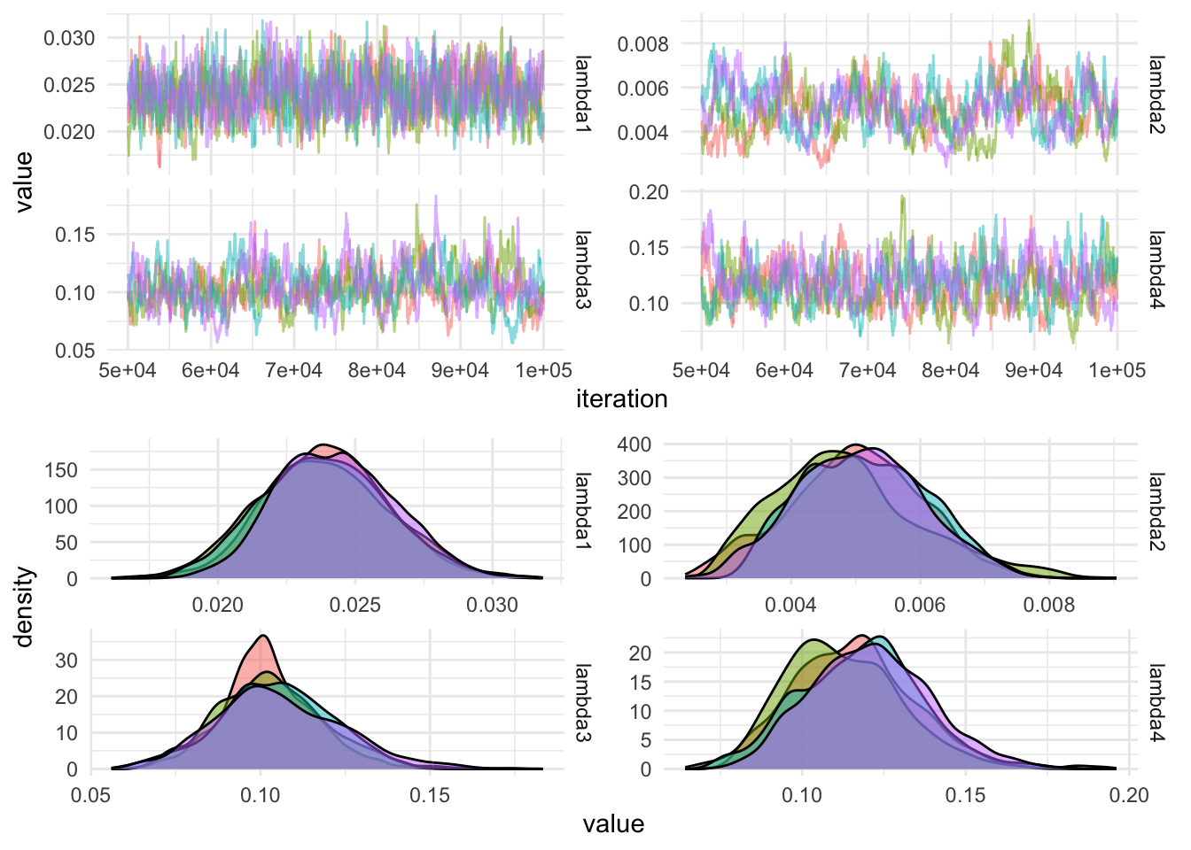 }We are ready to sample from the posterior distribution of the rate parameters using the Metropolis algorithm. We run four chains in parallel using furrr as explained in my previous post on efficient MCMC in R.