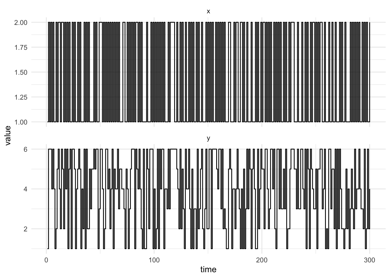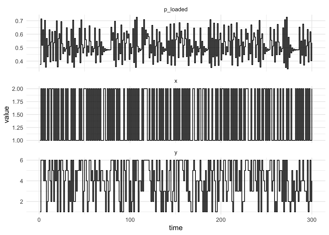 The plot below shows 300 simulations from the occasionally dishonest casino.