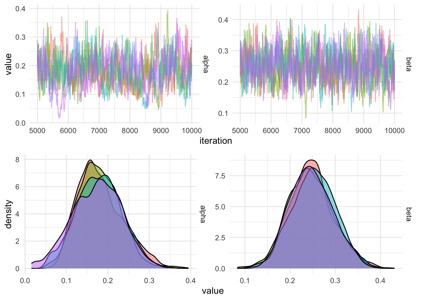 We draw 10,000 iterations from the Metropolis algorithm, the parameter diagnostics are plotted below.